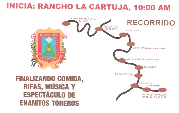 El día 12 de agosto se llevara a cabo la tradicional cabalgata, a partir de las 10:00 de la mañana, iniciando en el rancho La Cartuja, al finalizar habrá rifas, música, comida y un espectáculo de toreros enanos.