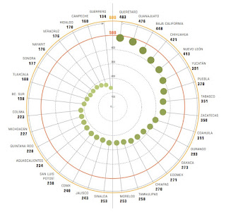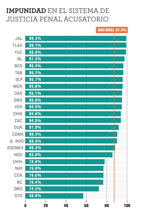 Los estados que superaron el 90 % de impunidad en 2016 (la última cifra oficial en materia de impunidad) fueron: Ciudad de México, Durango, Zacatecas, Chiapas, Veracruz, Guerrero, Oaxaca, Morelos, San Luis Potosí, Tabasco, Baja California Sur, Nuevo León, Yucatán, Tlaxcala y Jalisco: los dos últimos superaron el 99 % de delitos cometidos sin castigo. Incluso en la entidad mejor evaluada (Guanajuato), el nivel de impunidad superó la mitad de los delitos cometidos, llegando casi a 60%.