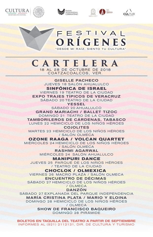 En Coatzacoalcos, el festival se denominará “Festival Orígenes, desde mi raíz siento tu cultura”, y sus actividades se desarrollarán en el Teatro de la Ciudad y en el Centro de Convenciones del 18 al 28 de Octubre y tendrá como escenarios alternos el Hemiciclo de los Niños Héroes, el Parque Independencia y la Pirámide del Malecón.