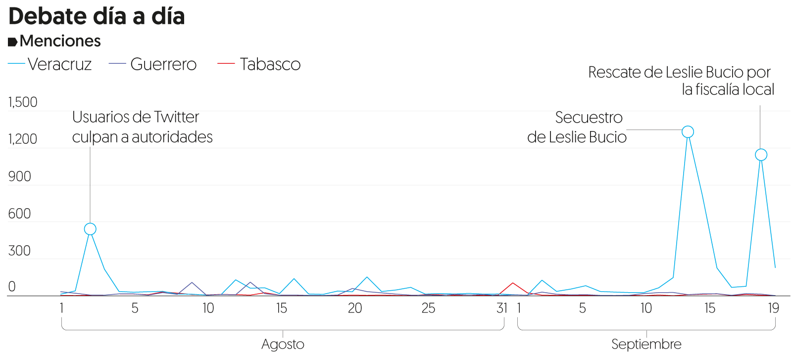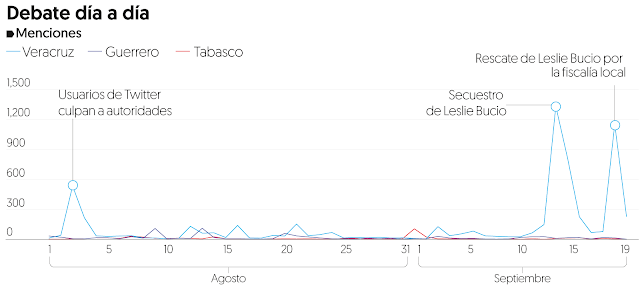 Entre el 1 de agosto y el 19 de septiembre, Veracruz fue el estado que acumuló la mayor cantidad de referencias al delito de secuestro en redes sociales y medios de comunicación digital, con seis mil 743 menciones, de las cuales 54 por ciento correspondió al caso de Leslie Jared.
