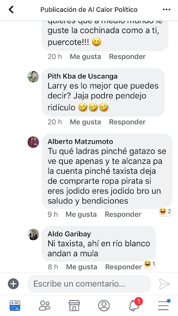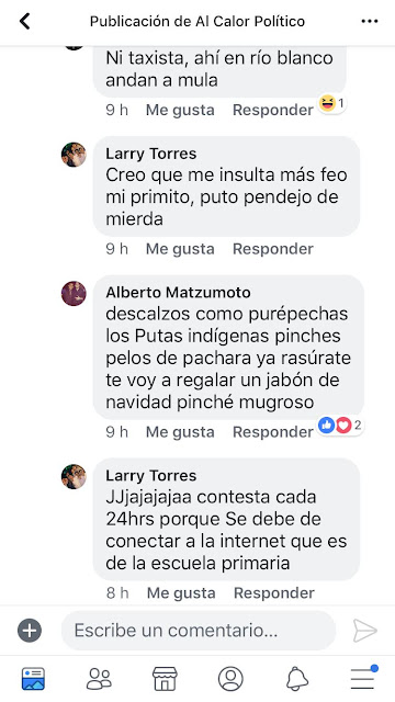 “Tu qué ladras pinché gatazo se ve que apenas y te alcanza pa la cuenta pinché taxista deja de comprarte ropa pirata si eres jodido eres jodido bro un saludo y bendiciones” seguido de “descalzos como purépechas los Putas indígenas pinches pelos de pachara ya rasúrate te voy a regalar un jabón de navidad pinché mugroso”, fueron los comentarios del sobrino de la presidenta de la CEDH.