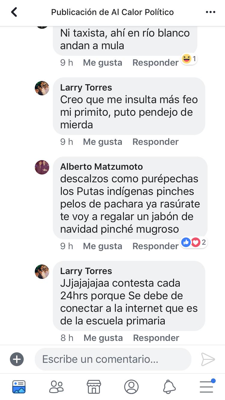 Luis Alberto Pérez Matzumoto, sobrino de la presidenta de la Comisión Estatal de Derechos Humanos, Namiko Matzumoto, en una riña en redes sociales llamó “gato” e “indígenas” a una persona que lo insultaba en una publicación del portal Al Calor Político.