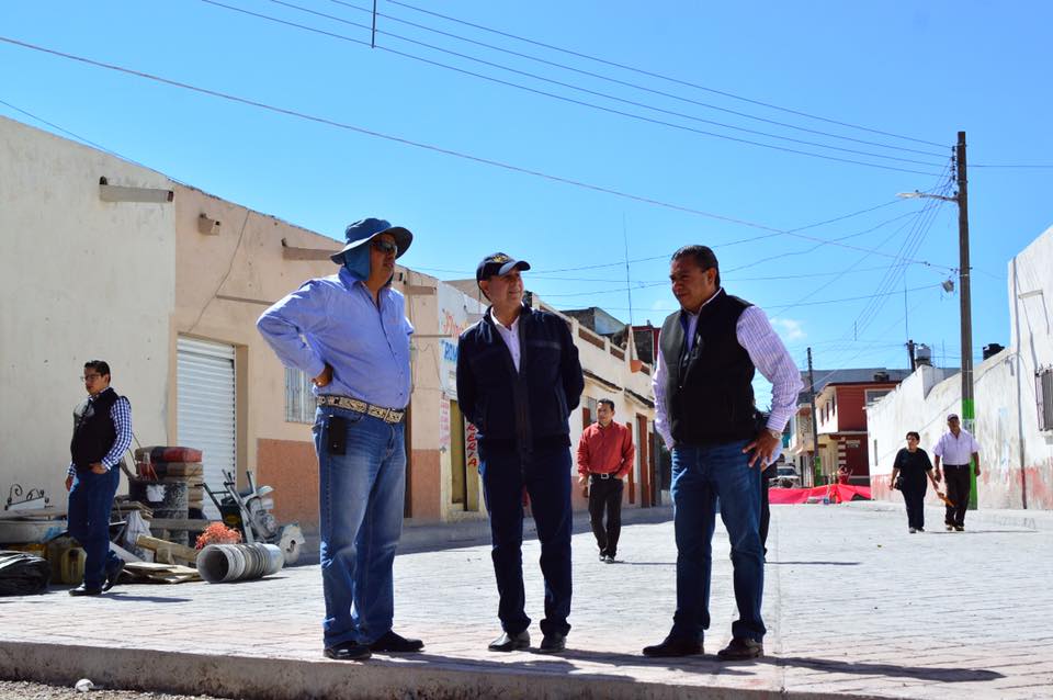 Las obras incluyen repavimentación con concreto hidráulico estampado y trabajos de alcantarillado.