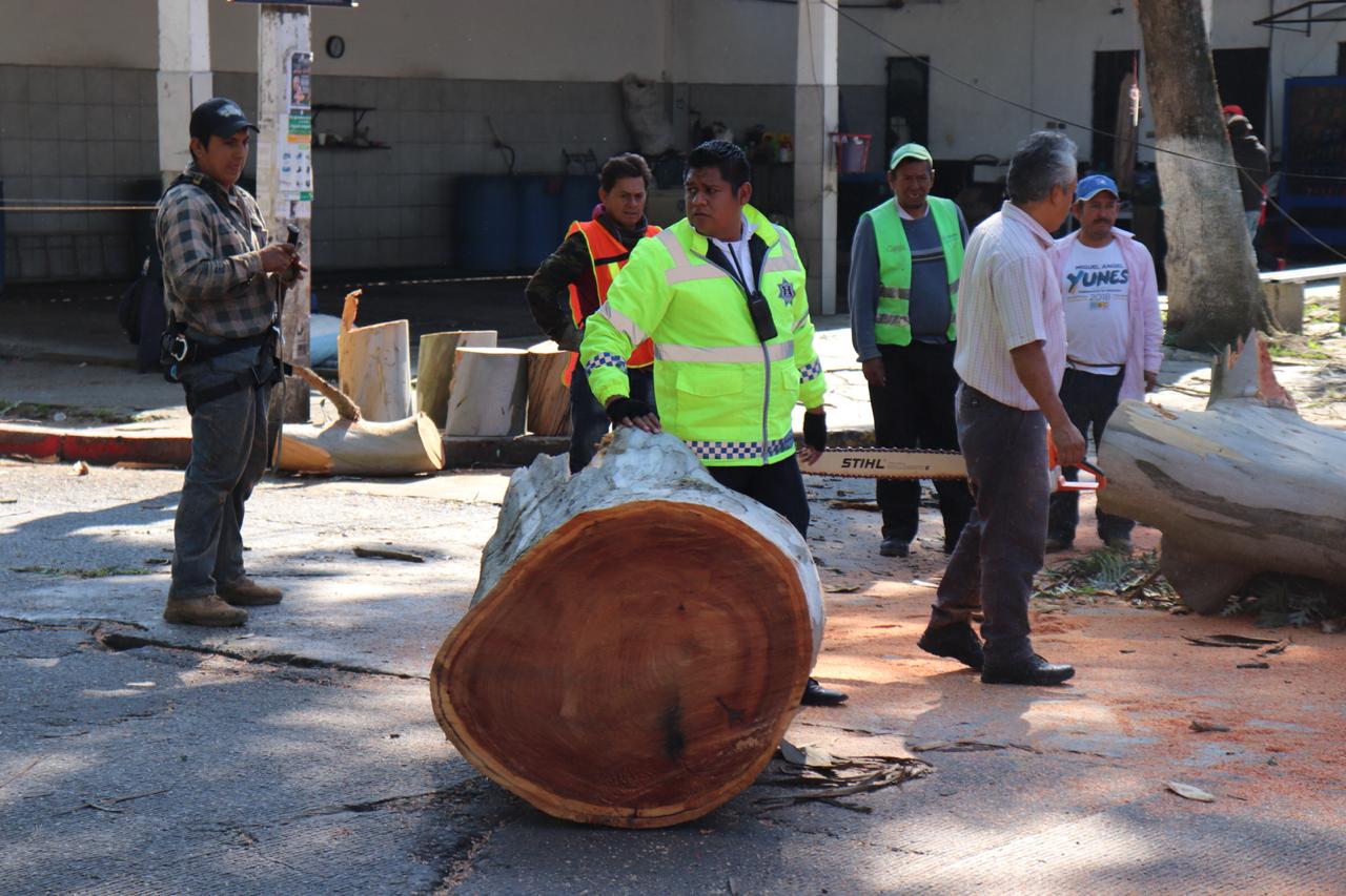 Personal de protección Civil municipal, tránsito del estado y Comisión Federal de Electricidad trabajan en el retiro del árbol.