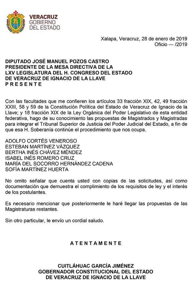 El gobernador Cuitláhuac García Jiménez ya envió al Congreso del Estado los primeros 6 nombres de sus propuestas para ocupar una de las 13 plazas para magistrados.