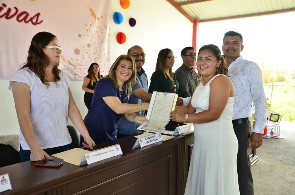 El Presidente Municipal, Jorge Alberto Mier Acolt en compañía de su esposa, la Presidenta del Sistema DIF Municipal de Emiliano Zapata, L.C.C. Doralina Quesada Sedas, el Oficial del Registro Civil, Uriel Moreno Celis, en representación del Gobernador del Estado de Veracruz, la Sria. Particular de la Secretaría de Protección Civil, Tania Carola Viveros Cházaro y el Cabildo Municipal entregaron las 105 actas matrimoniales que dan certeza jurídica a las parejas presentes.