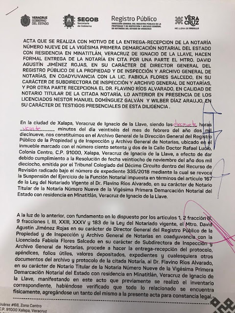 Cabe señalar que el protocolo de entrega de su notaría fue efectuado el martes pasado por David Agustín Jiménez Rojas, director general de Registro Público de la Propiedad y de Inspección y Archivo General de Notarías, junto con Fabiola Flores Salcedo, subdirectora de Inspección y Archivo General de Notarías.