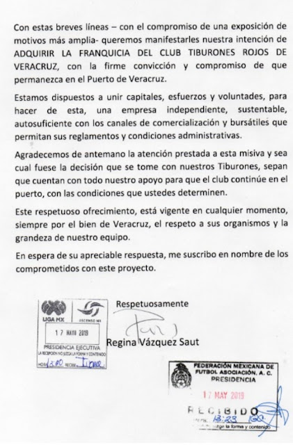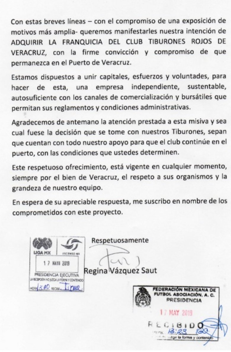 Se trata de Regina Vázquez Saut, empresaria veracruzana y exdiputada del PRI, que por medio de un documento dirigido a Yon de Luisa, Presidente de la Federación Mexicana de Futbol y Enrique Bonilla, Presidente de la Liga MX, les manifestó su interés por comprar al conjunto veracruzano.