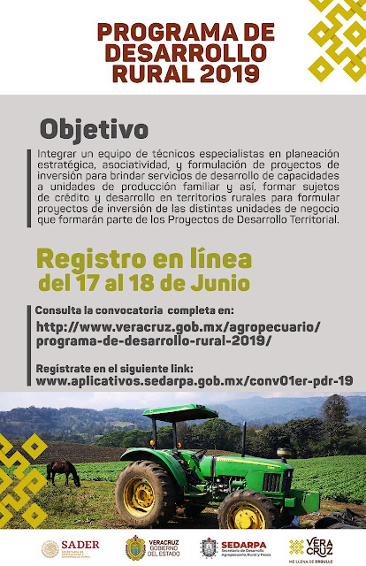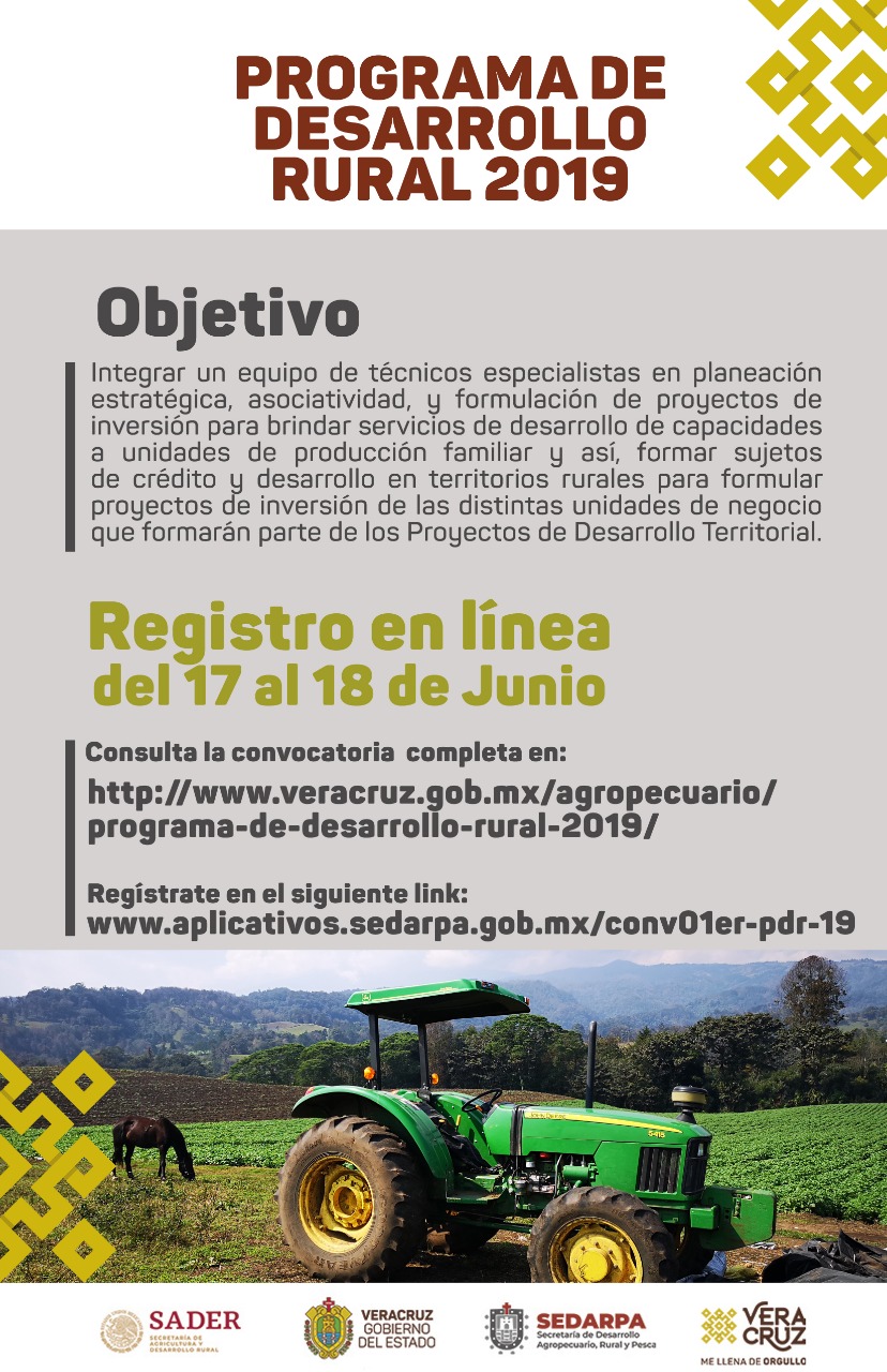 Los aspirantes a un cargo de Técnico Especialista pueden consultar la convocatoria completa en la siguiente liga: http://www.veracruz.gob.mx/agropecuario/programa-de-desarrollo-rural-2019, en donde los interesados podrán inscribirse para ser contratados a la mayor brevedad.
