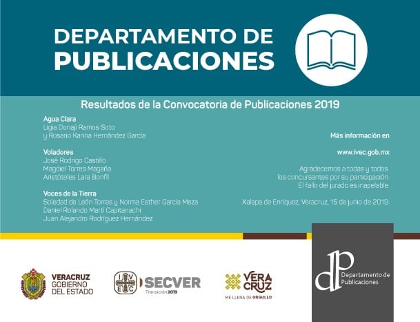 El Instituto Veracruzano de la Cultura (IVEC) informó que el jurado calificador de la Convocatoria de Publicaciones 2019, integrado por los escritores Enrique Díaz Álvarez, José Andrés Acosta Cuevas, Amaranta Leyva Pérez Gay y Antonio Jesús Ramos Revillas, seleccionó siete volúmenes para su publicación, entre 35 propuestas recibidas en tres categorías.