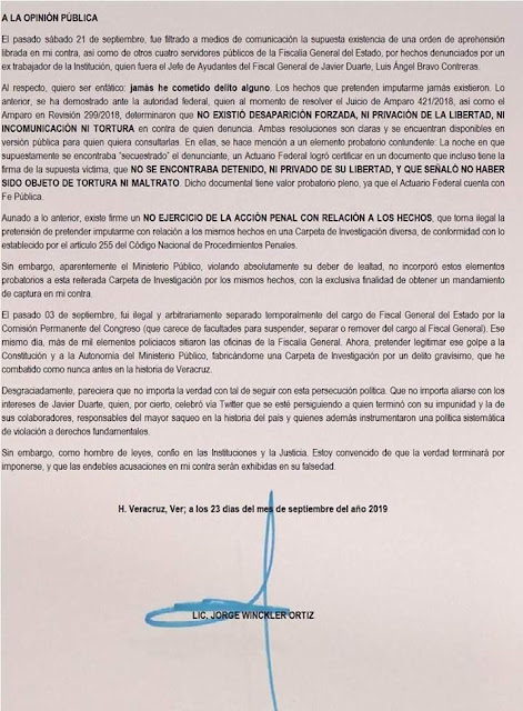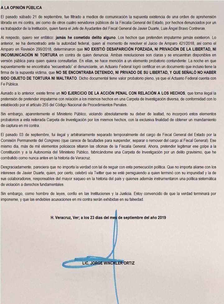 Esta mañana fue filtrada a todos los medios de comunicación una carta firmada por el ex fiscal Jorge Winckler Ortiz, -a quien la autoridad busca por el delito de secuestro- donde acusa de persecución política hacia su persona.
