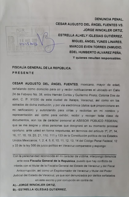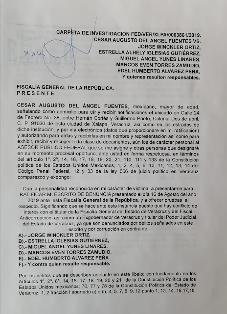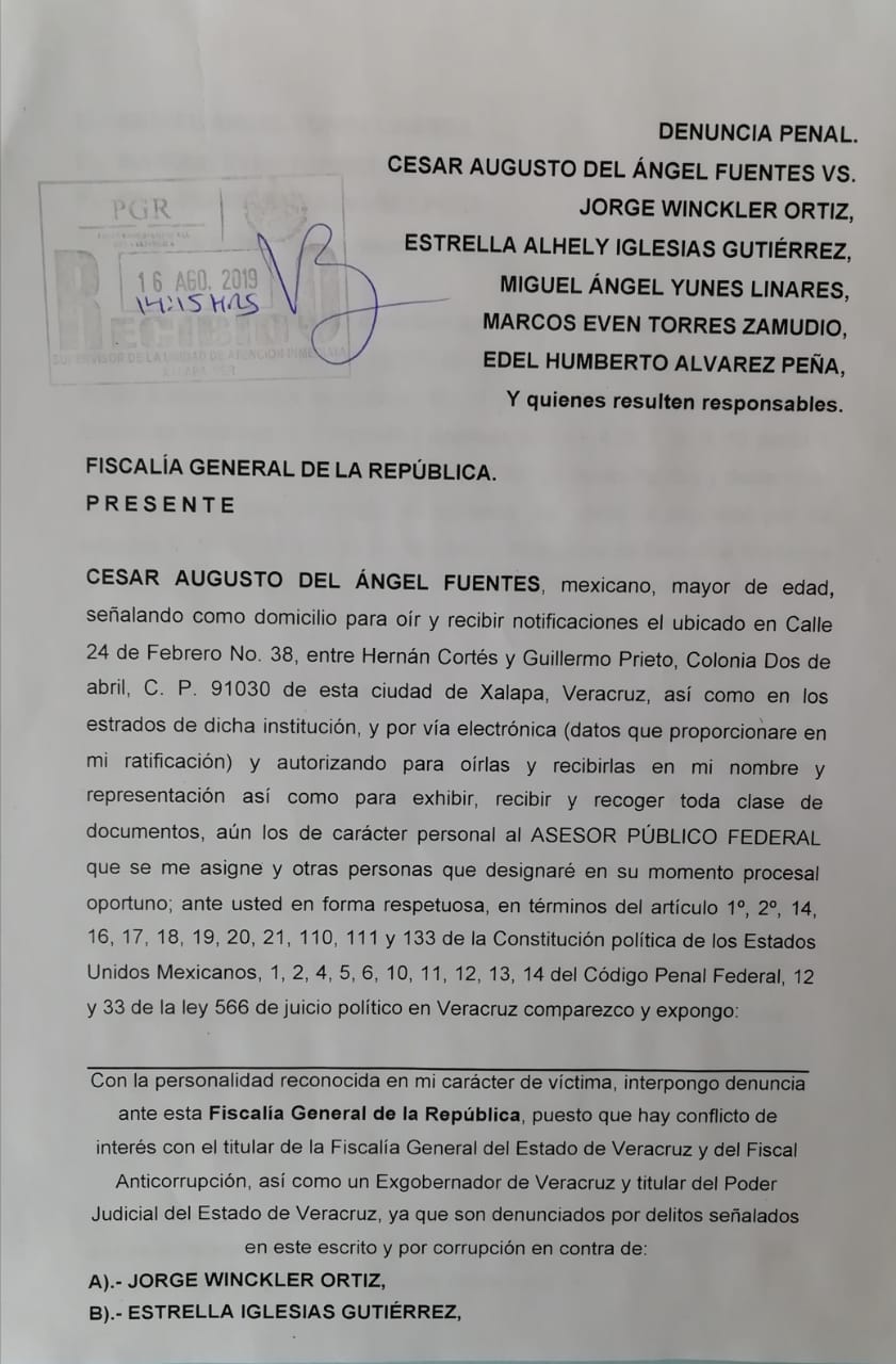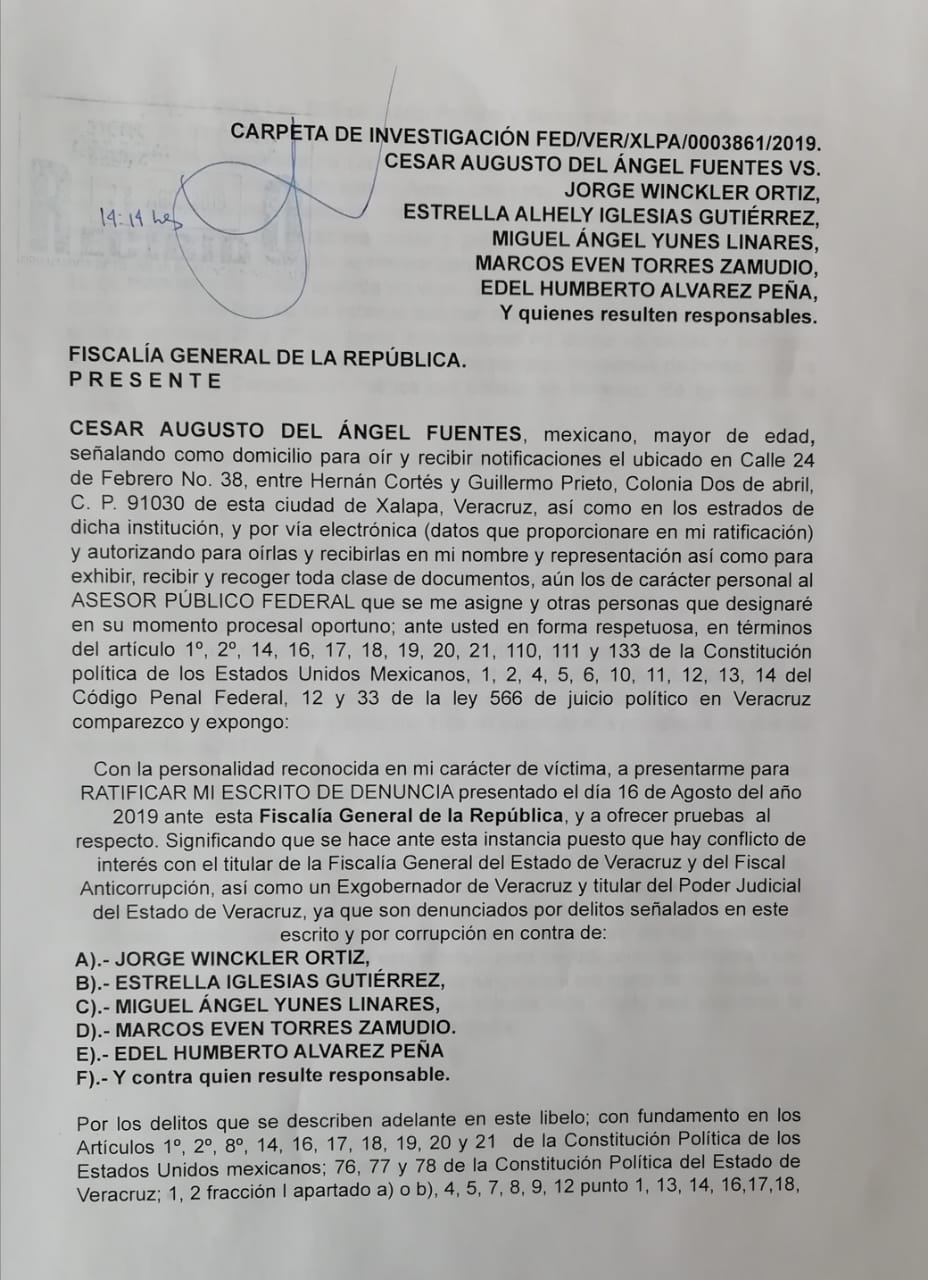 El dirigente de los 400 pueblos, Cesar del Ángel Fuentes, se presentó este día al Congreso local del Estado, a presentar una solicitud de juicio político contra el ex fiscal Jorge Winckler Ortiz y el ex gobernador Miguel Ángel Yunes Linares, por incumplimiento de un deber legal, fabricar delitos y es el verdadero responsable, no por perseguir a Winckler se olviden de Yunes, que es “El huevo de la víbora que todavía está vivo”, dijo del ángel Fuentes.