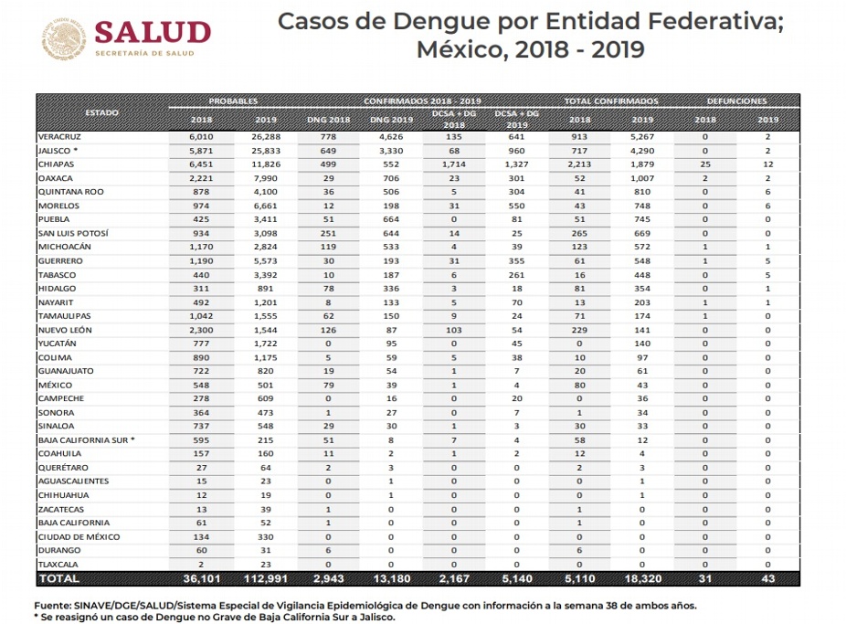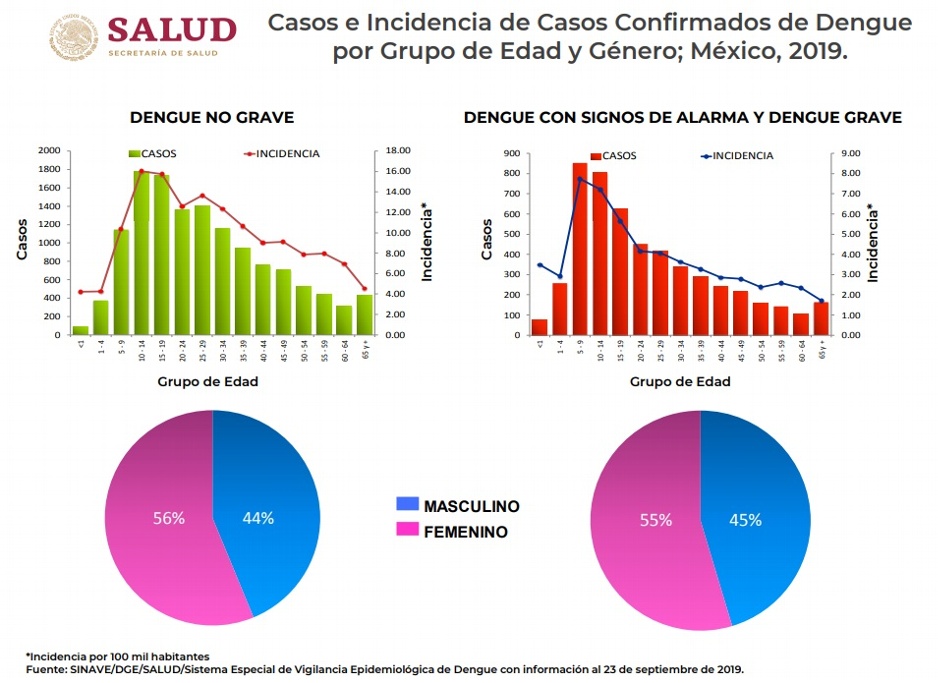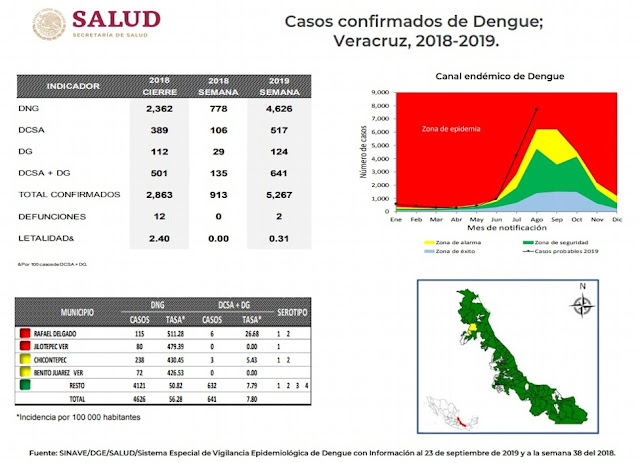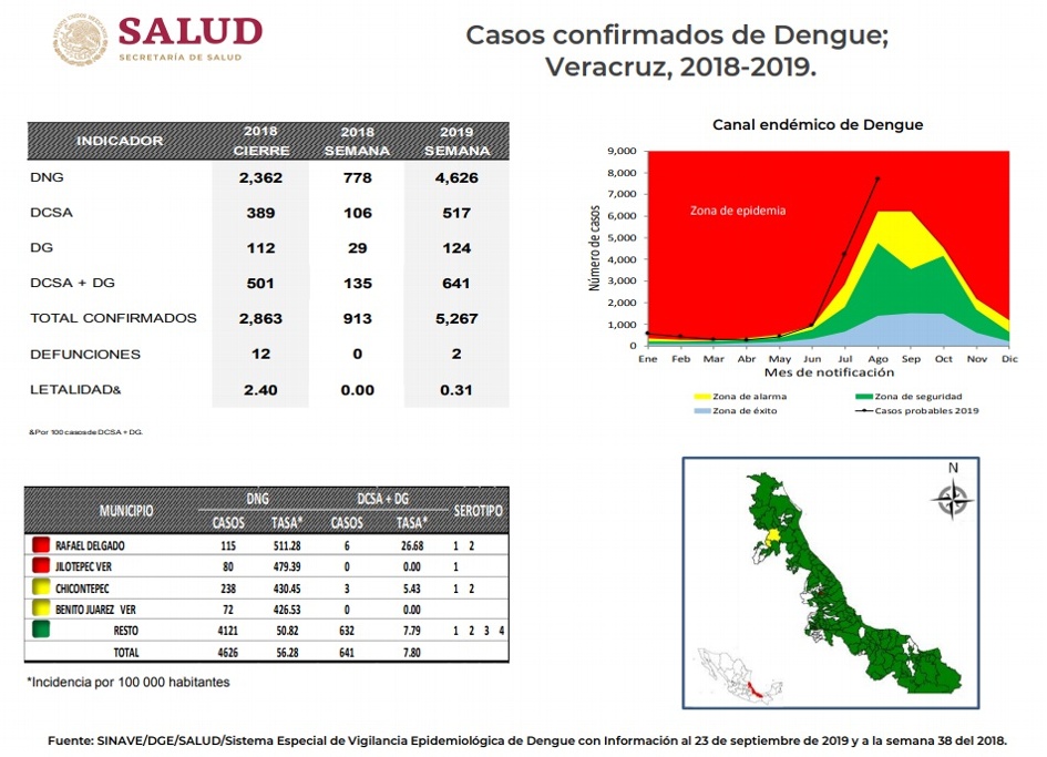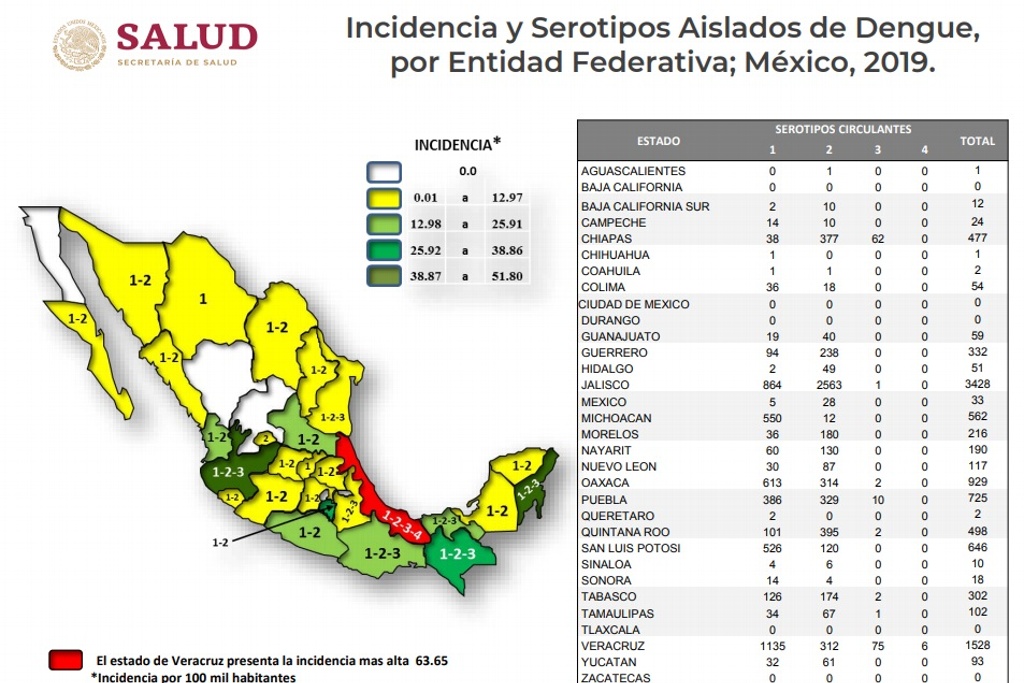 Según el informe de la Secretaría de Salud, Casos e Incidencia de Dengue por Entidad Federativa; México, 2019, muestra a Veracruz con 4 mil 626 casos de dengue no grave (DNG), 517 de dengue con signos de alarma (DCSA) y 124 de dengue grave (DG).