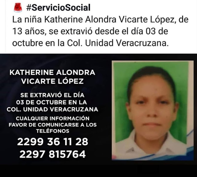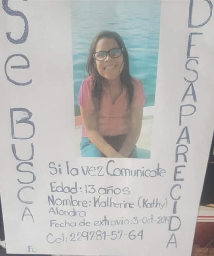 Reportan la desaparición de la niña Katherine Alondra Vicarte López, quien fue vista por última vez la tarde del pasado 3 de octubre en el callejón Paul Harris ,en la colonia Unidad Veracruzana en la ciudad de Veracruz.