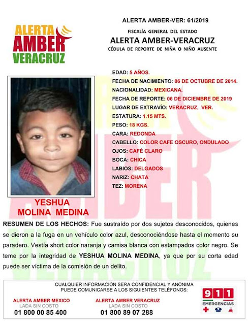 Yeshua Molina Medina, de 5 años de edad, fue raptado por dos sujetos en el fraccionamiento Torrentes la noche de este jueves en el puerto de Veracruz.