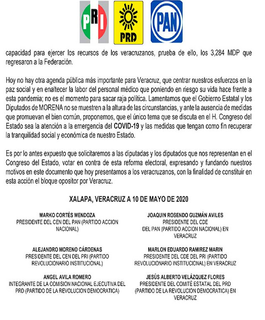 En un desplegado, dirigentes nacionales del PRD, Ángel Ávila Romero; del PAN, Marko Cortés Mendoza; y del PRI, Alejandro Moreno Cárdenas, así como los del Estado, Jesús Alberto Velázquez Flores, Joaquín Rosendo Guzmán Avilés y Marlon Ramírez Marín, respectivamente, anunciaron que con esta acción constituirán un bloque opositor por Veracruz.