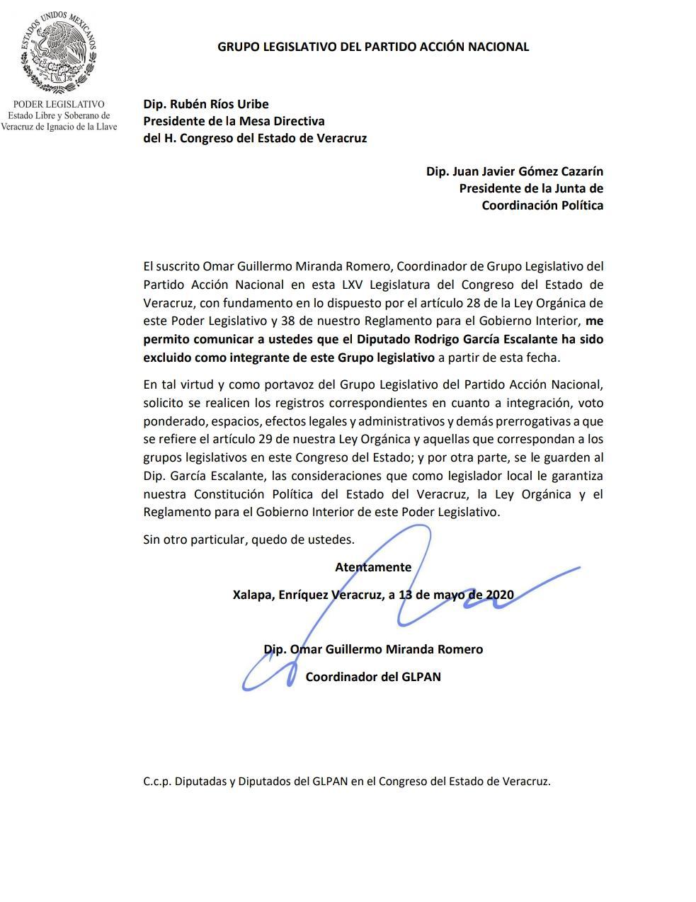 “Me permito comunicar a ustedes que el diputado Rodrigo García Escalante ha sido excluido como integrante de este grupo legislativo”, da a conocer Miranda Romero a los diputados presidentes de la Mesa Directiva, Rubén Ríos Uribe, y la Junta de Coordinación Política, Juan Javier Gómez Cazarín.