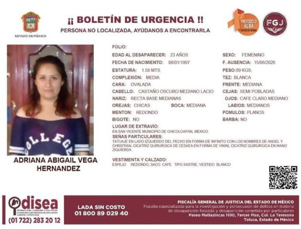 Laura Hernández Méndez, busca desde el Estado de México desesperadamente a su hija, Abigail Vega Hernández, de 23 años de edad, quien desde el 15 de junio de este año salió rumbo a Coatzacoalcos con la promesa de un trabajo y a la fecha no ha vuelto a casa ni tiene informes de ella.