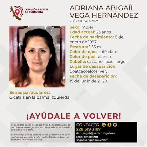 “Me robaron a mi hija Adriana Abigail Vega Hernández, 23 años, salió de casa con propuesta de trabajo ya no regreso a casa”, escribió a la redacción de Costa Veracruz.