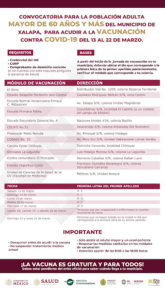 El Director de Salud Pública en Veracruz, Salvador Beristain Hernández informó que como parte del Plan de Vacunación Nacional, el próximo sábado 13 de marzo inicia la vacunación de adultos mayores con domicilio en el municipio de Xalapa.