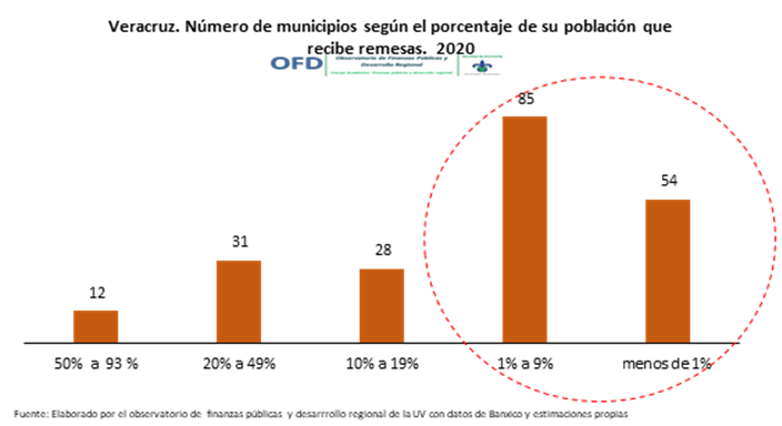 Además, este beneficio se distribuye regionalmente de manera muy desigual, beneficiando a porciones poco significativas de la población de cada municipio: en 139 municipios entre 1 y 9% de la población recibe remesas, en otros 28 municipios, entre 10 y 19% tiene este beneficio, en otros 31 municipios el porcentaje de la población que recibe estos recursos va de 20 a 49% y sólo en 12 municipios beneficia más del 50% de la población. Por lo anterior es claro que es muy pequeño el impacto que tienen las remesas, tanto a nivel individual, es decir por persona, como a nivel regional ya que, como se ve, los recursos que se reciben por persona son pocos y sólo benefician a unos cuantos.