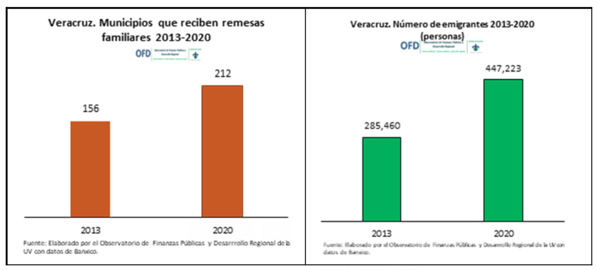 El profundo estancamiento económico que vive Veracruz desde 2013, ha propiciado desempleo y pérdida de oportunidades para el mejoramiento del bienestar social, lo cual es la principal causa del pronunciado incremento de la migración y extendiéndose por todo el territorio estatal, según puede corroborarse al observar que, en 2013, el número de municipios que recibían remesas del extranjero era un total de 156, de donde habían emigrado 285,460 personas, pero en 2020 ese número de municipios se incrementó a 212, es decir, prácticamente todos los municipios en el estado expulsan población al exterior, por lo que el número de emigrantes aumentó a 447,223 personas, es decir, un incremento de 57% con respecto a 2013.
