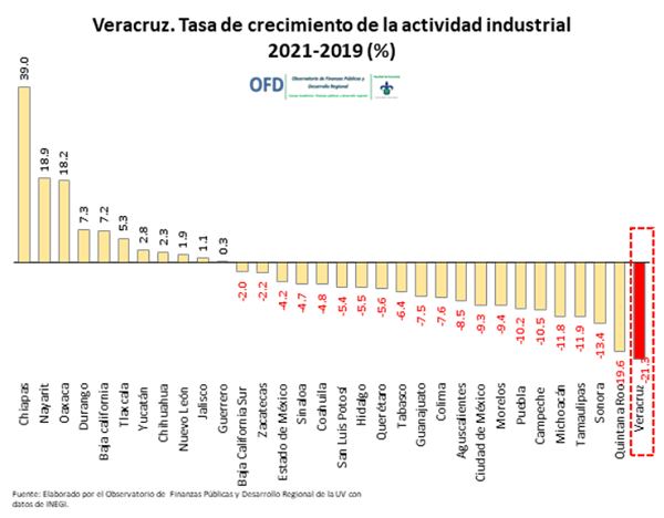 Veracruz se ubica actualmente en el último lugar a nivel nacional, por ser el Estado con mayor caída en la producción industrial durante la pandemia, con una variación porcentual de -21.3% en mayo de 2021 comparado con el valor observado en 2019. Y esto contrasta con el comportamiento de otros 11 estados, los cuales mostraron crecimiento en el mismo período, destacando Chiapas con un aumento de 29%, Nayarit con 18.9% y Oaxaca con 18.2%. Asimismo, se observa que otros 20 estados tuvieron decrecimiento productivo, pero no en la magnitud que presenta Veracruz, pues en 16 de estos, la reducción de la producción es, apenas, equivalente a la mitad o menos de la que registra la industria veracruzana.
