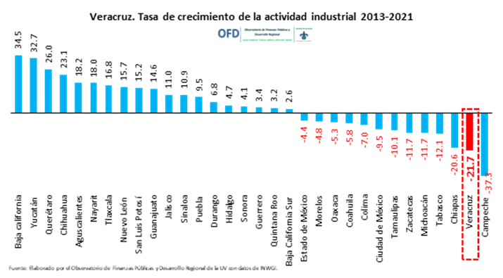 Estas tendencias negativas colocan a Veracruz en el penúltimo lugar entre todos los estados, debido al profundo decrecimiento productivo de la industria de -21.7% que registra durante el período 2013-2021. Observándose que hay otros 19 estados que mostraron un comportamiento positivo al registrar tasas positivas de crecimiento de la producción industrial, destacando Baja California con 34%, Yucatán con 32.7%, Querétaro 26% y Chihuahua con 23%. Asimismo, hay otros 12 estados que tuvieron decrecimiento en el mismo período, sin embargo, en la mayoría de estos, la disminución es equivalente a la mitad o menos de la reducción que presenta Veracruz. Es notable que entre los estados que exhiben reducción en la producción durante este período de 8 años, se encuentren, junto con Veracruz, el resto de los principales estados productores de petróleo, Campeche, Tabasco Chiapas y Tamaulipas, lo cual evidencia que gran parte de esta larga crisis industrial es resultado de las adversas tendencias del mercado mundial del petróleo y la pérdida de la industria petrolera para impulsar el crecimiento económico, como lo hizo en el pasado.