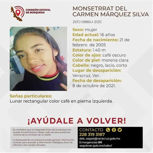 Por su parte, la adolescente Monserrat del Carmen Márquez Silva, de 16 años, desapareció desde el día 8 de octubre, por lo que su familia la busca desesperadamente.