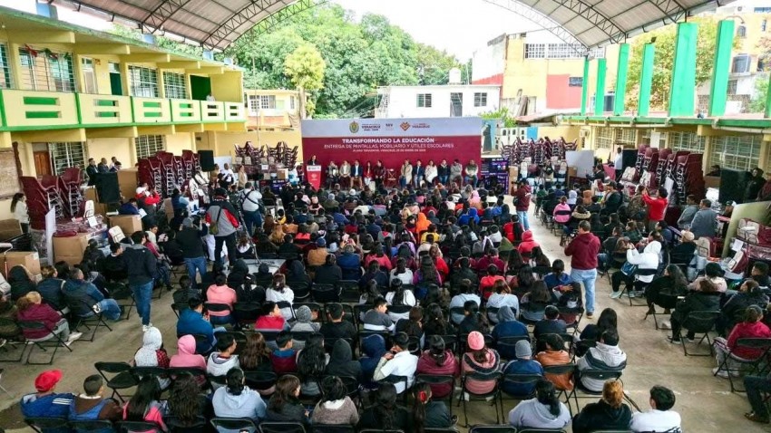 Durante su segunda visita al municipio en lo que va del año, explicó que, como respuesta a los daños provocados por las inundaciones de octubre pasado, el Estado entregó mil 633 kits escolares, 863 sillas, 432 mesas trapezoidales, 10 pupitres para personas zurdas, 158 cubetas de impermeabilizante, 98 cubetas de pintura, 74 pizarrones y 31 pantallas de 55 pulgadas para telesecundarias, así como 28 brochas y 28 rodillos.