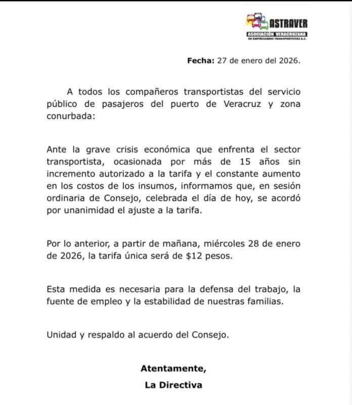 Este martes la Asociación Veracruzana de Empresarios Transportistas A.C. (ASTRAVER), di a conocer en un comunicado que a partir de este miércoles 28 de enero de 2026, la tarifa del transporte público de pasajeros en el puerto de Veracruz y la zona conurbada aumentará a 12 pesos, el ajuste fue aprobado por unanimidad durante una sesión ordinaria de Consejo celebrada este martes 27 de enero, según se detalla en el documento difundido entre transportistas del servicio urbano.