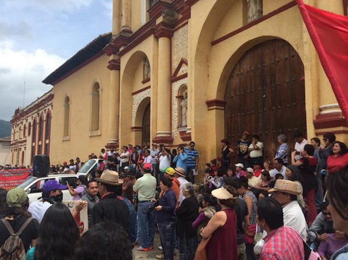 Decenas de ciudadanos en San Cristóbal de las Casas inician el pase de lista de los 43 en la Plaza de la Resistencia. Los asistentes portan pancartas para exigir a las autoridades la presentación con vida de los normalistas y gritan consignas como: ¡Ayotzinapa Vive! y ¡Justicia para los 43!