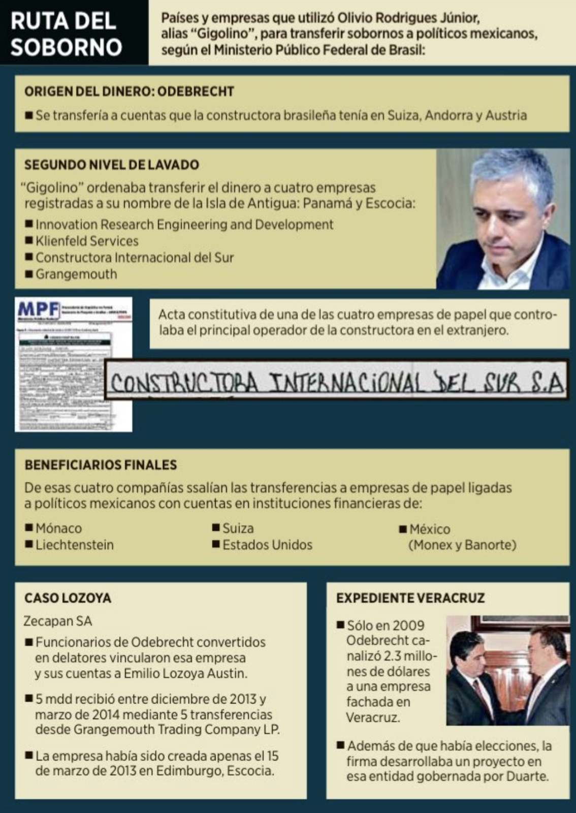 El esquema financiero al que recurrió la empresa brasileña para ocultar los sobornos pagados a políticos mexicanos involucra operaciones en por lo menos 10 países, de acuerdo con el expediente que ha integrado el Ministerio Público (MP) de Brasil.