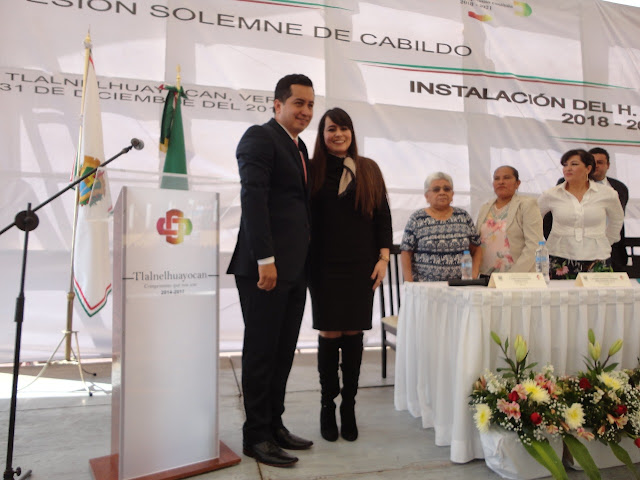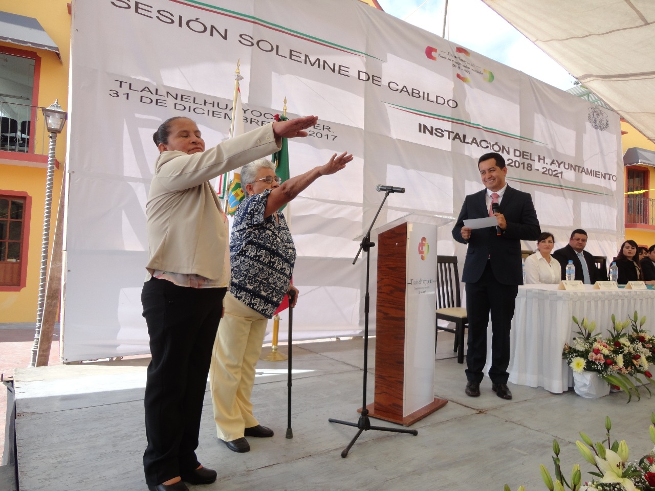 En Sesión Solemne de Cabildo, la alcaldesa saliente, la maestra Arianna Guadalupe Ángeles Aguirre fue la encargada de tomarle la protesta de Ley al Maestro David Ángeles Aguirre a quien, a partir de este uno de enero, gobernará el municipio de Tlalnelhuayocan.