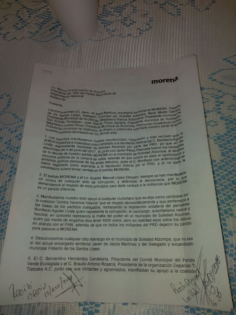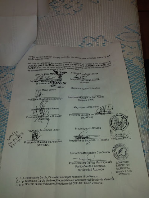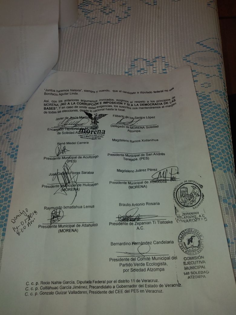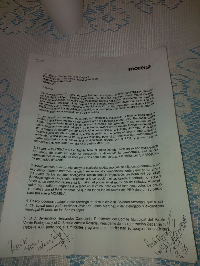 Firmantes: Javier de Jesús Martínez, encargado territorial de MORENA; Javier de los Santos López, delegado de MORENA: René Medel Carrera, alcalde de Acultzingo; José Gabriel Flores, presidente municipal de Huiloapan; Magdaleno Juárez Pérez, alcalde de Xoxocotla; Raymundo Ixmatlahua Lemus, presidente municipal de Atlahuilco, entre otros líderes más.