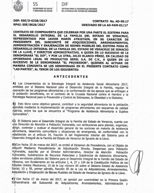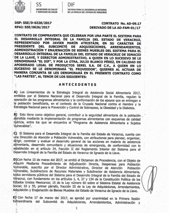 Conforme al contrato SSE/D-0228/2017 celebrado entre el DIF de Veracruz y la citada empresa el 15 de marzo del año pasado, se acuerda la adquisición de 296 mil 200 despensas por el pago de 39 millones 957 mil 380 más IVA de 417 mil 642 pesos, para un total de 40 millones 375 mil 22 pesos.