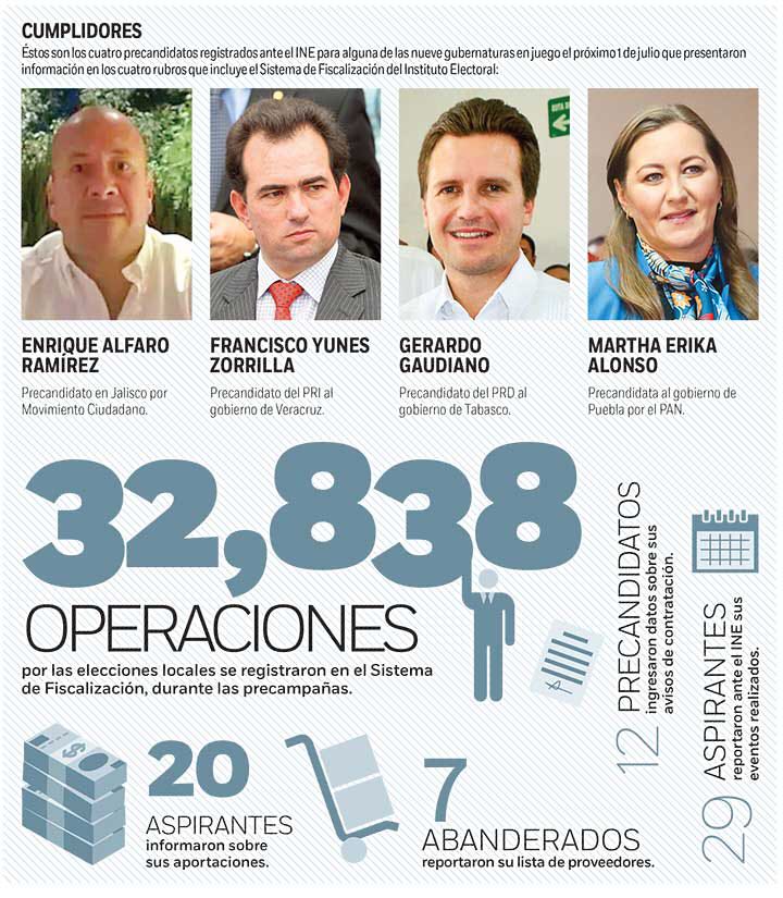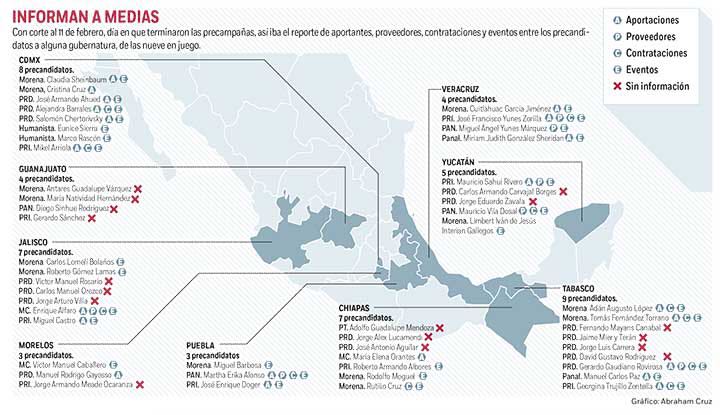 José Yunes Zorilla informó sobre aportaciones, proveedores, contrataciones y eventos, esto al corte 11 de febrero fecha de cierre de precampañas. Por el contrario, Cuitláhuac García, precandidato de MORENA, únicamente informó sobre aportaciones y eventos; mientras que Miguel Ángel Yunes Márquez, candidato del PAN, solo informó sobre proveedores y eventos.