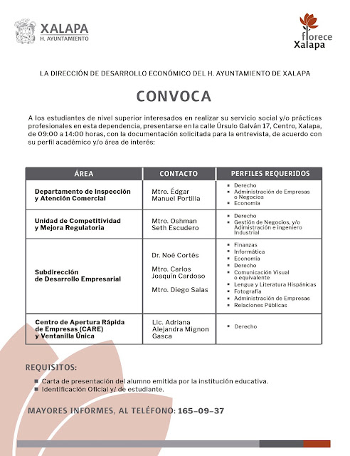 La Dirección de Desarrollo Económico del Ayuntameinto de Xalapa convoca a los estudiantes de nivel superior, a realizar su servicio social en esta dependencia municipal.