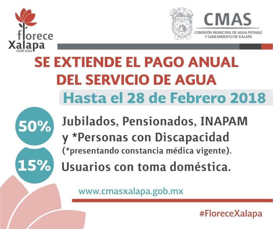 En el pago anual anticipado del servicio de agua potable, se mantiene hasta hoy miércoles 28 de febrero los descuentos de 15% a usuarios con toma doméstica, y 50% a jubilados, pensionados y personas con credencial del INAPAM.