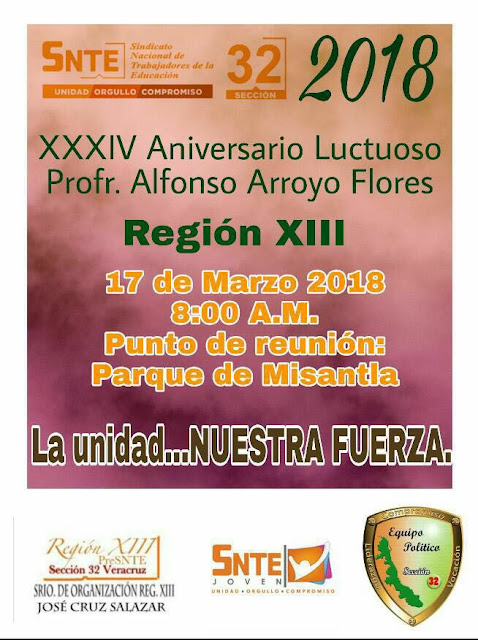Con el Eslogan “La unidad…Nuestra Fuerza”, maestros de la Región XIII del sur de Veracruz, se preparan para asistir a Misantla, Veracruz, el próximo 17 de marzo ya que como cada año, se le rendirá un homenaje luctuoso en su Mausoleo al maestro ALFONSO ARROYO FLORES… se trata de profesores afilados a la aún poderosa la Sección 32 del Sindicato Nacional de Trabajadores de la Educación (SNTE), de la cual fue columna vertebral el recién fallecido maestro JUAN NICOLÁS CALLEJAS ARROYO, se trata pues, del famoso “Equipo Político”…