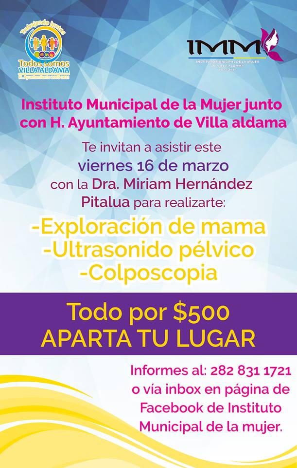 El Instituto Municipal de la Mujer y el Ayuntamiento de Villa Aldama, invitan a las mujeres a realizarse estudios, como la exploración de mama, ultrasonido pélvico y colonoscopías a muy bajo costo.