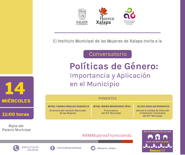 El ayuntamiento de Xalapa y el Instituto Municipal de las Mujeres invitan al conservatorio “Políticas de Género: Importancia y Aplicación en el Municipio”