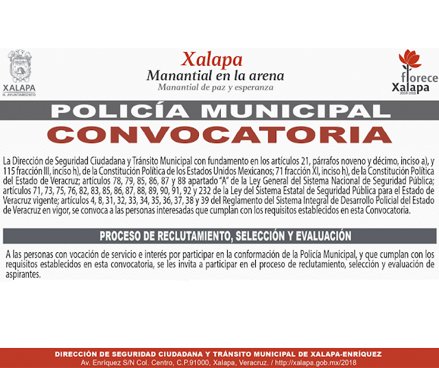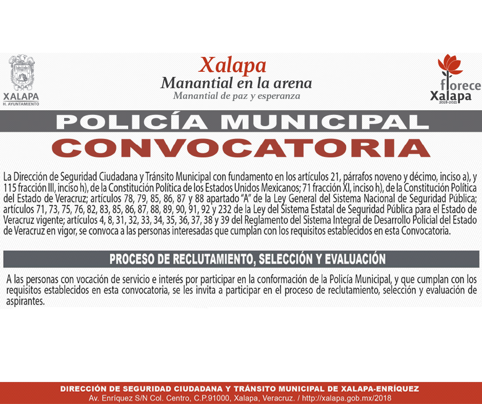 El H. Ayuntamiento de Xalapa convoca a quienes estén interesados en integrarse a la nueva Policía Municipal Preventiva.