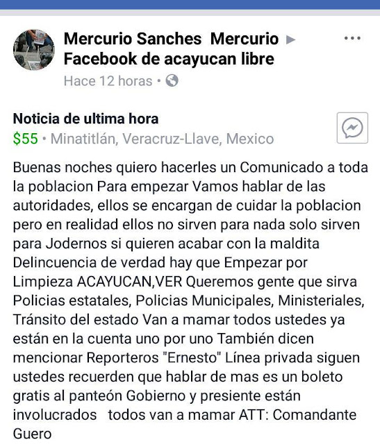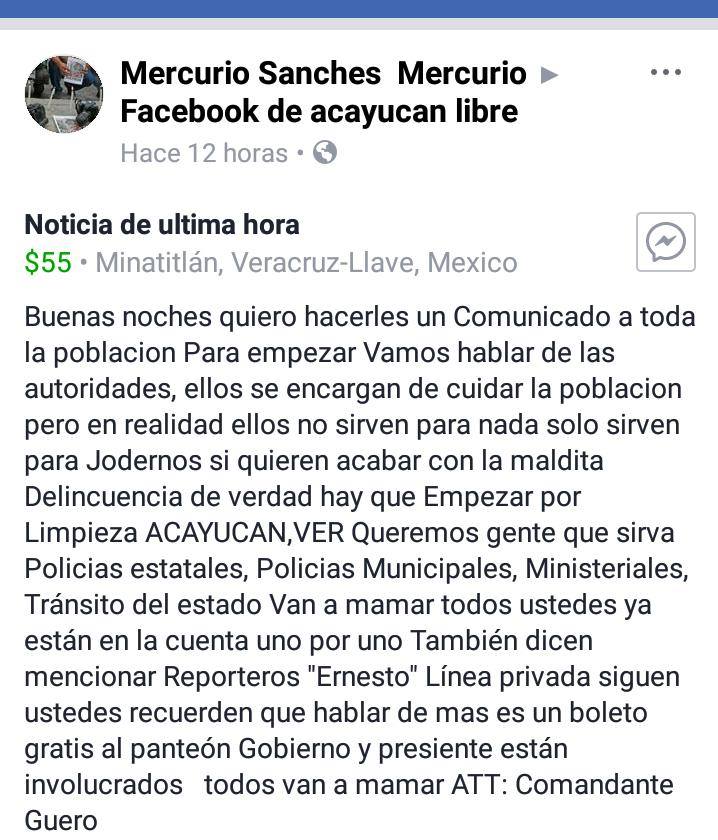 Desde una cuenta de Facebook falsas de alguien que se identifica como “Mercurio Sánchez Mercurio”, desde el día martes ha lanzado amenazas con un reportero de nombre Ernesto (Granados Hernández) y contra LÍNEA PRIVADA. El primer compañero es reportero de la sección policiaca del diario de Acayucan. Por medio de mensajes a las cuentas privadas del citado reportero y de LÍNEA PRIVADA, ha lanzado amenas llamándose “Comandante Guero”.