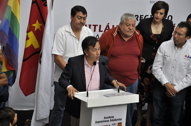 Representantes de los partidos en coalición entregaron los papeles del registro a los consejeros del OPLE en nombre de su candidato, quien se encontraba en el patio de las instalaciones del organismo realizando un mitin con los militantes de los diferentes partidos.