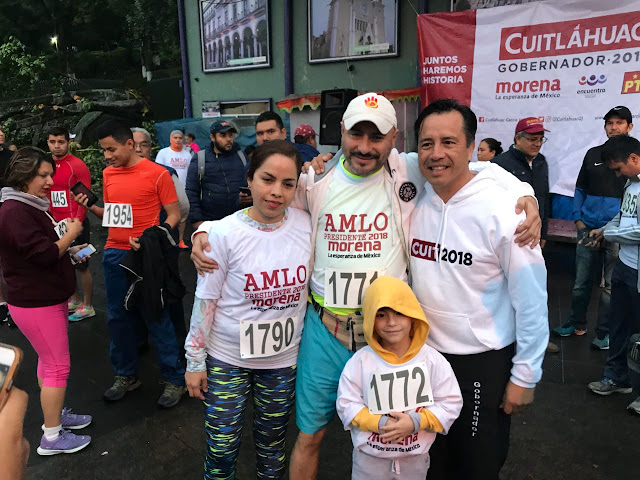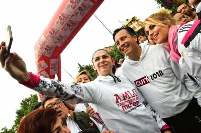 Cuitláhuac García Jiménez, candidato de la coalición Juntos haremos historia para gobernador de Veracruz, inició su campaña proselitista con una carrera de cuatro kilómetros, donde estuvo acompañado por la medallista y senadora Ana Gabriela Guevara.