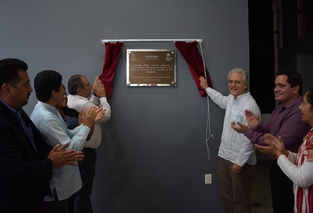 La primera jornada culminó con la develación de una placa que consigna la imposición del nombre del autor, Premio Miguel de Cervantes 2005, al auditorio de la Iniciativa Municipal de Arte y Cultura (IMAC).