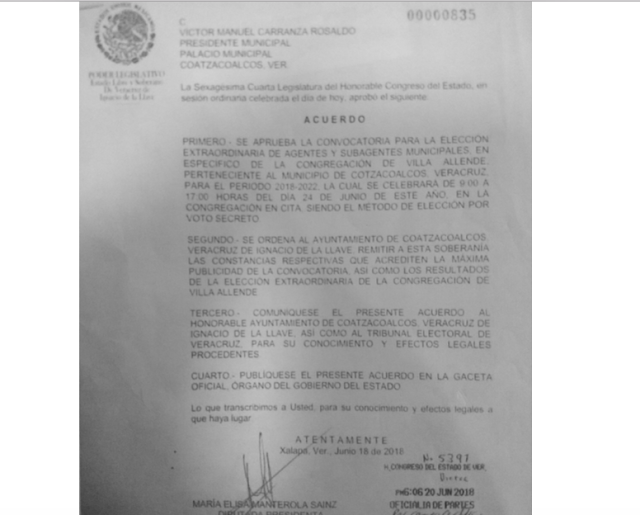 De fecha de cuatro de mayo de 2018 el Tribunal Electoral del Estado de Veracruz en la sentencia emitida para el expediente TEV-JDC-111/2018 y sus acumulados ordena al Ayuntamiento de Coatzacoalcos que emita una nueva determinación respecto a la validez o no de la elección de Agente Municipal de la congregación de Villa Allende.
