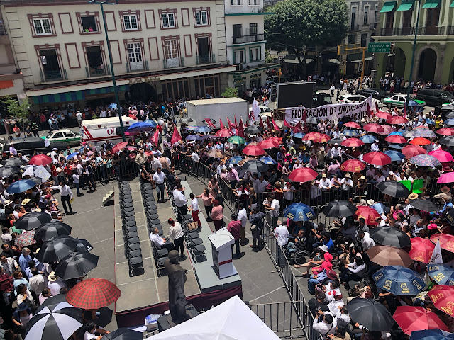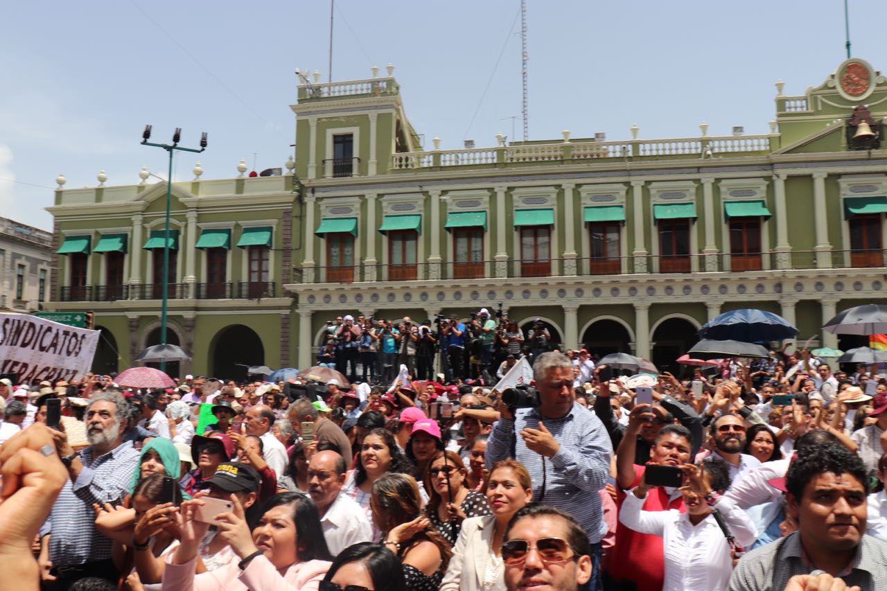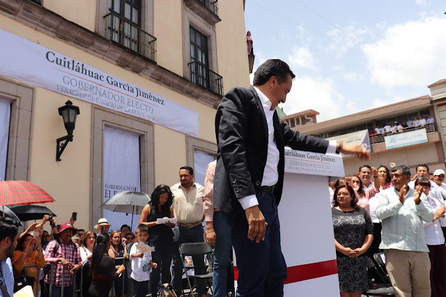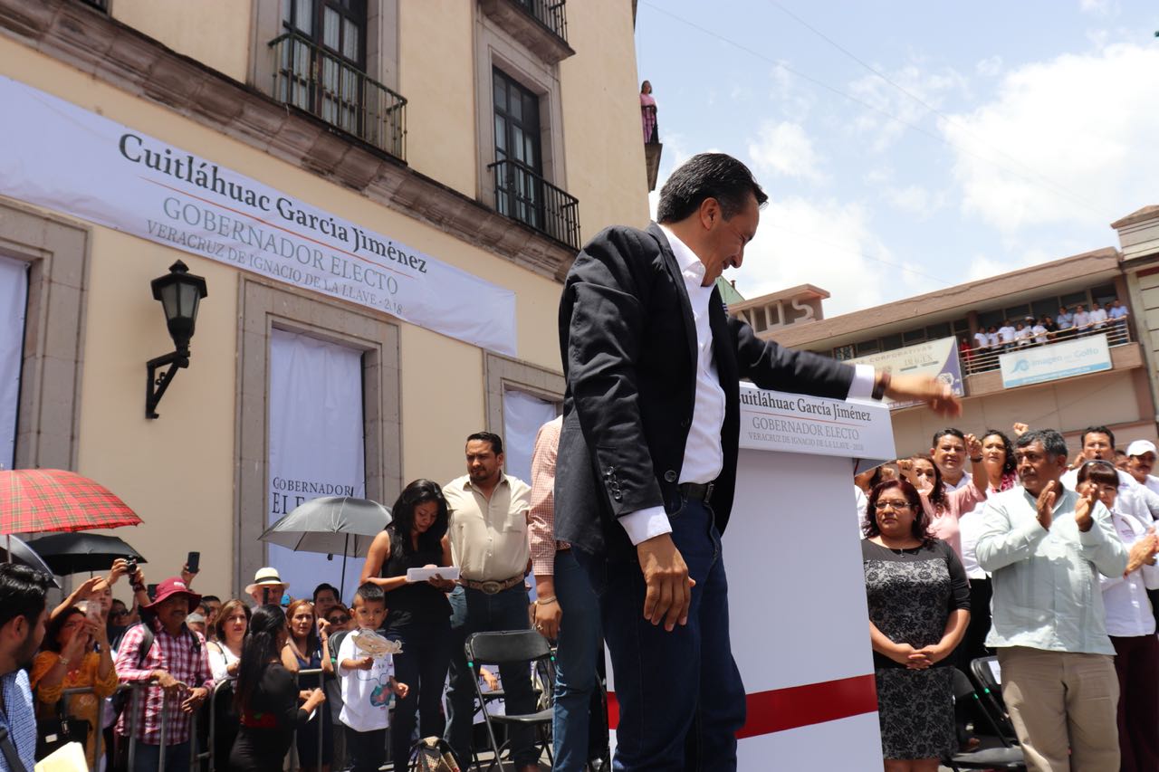 +Ante cientos de personas que se reunieron en la Plaza Lerdo de Xalapa, la capital veracruzana, el gobernador electo Cuitláhuac García Jiménez emitió su primer mensaje desde que se le entregó el acta de mayoría.