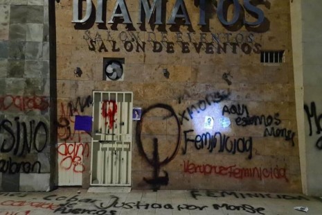 Feministas pintan salón propiedad de padres de Marlon, acusado por el asesinato de Monse